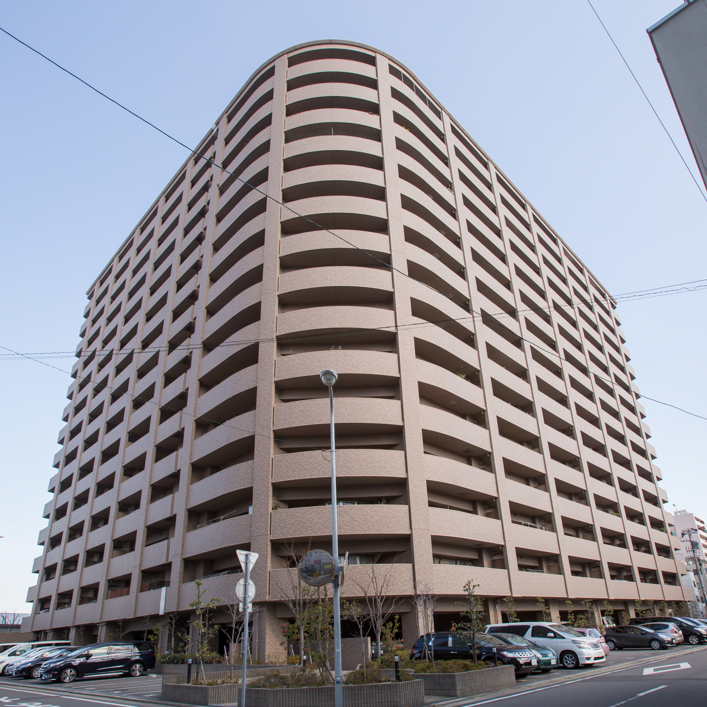 重厚感溢れるエントランスが特徴。ペット飼育が可能で近隣のサンポートは毎日のお散歩コースに最適。